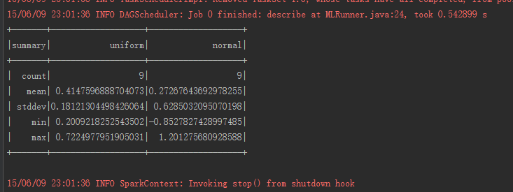 Spark中的描述统计提供了计数,均值,标准差,最大最小值等信息。